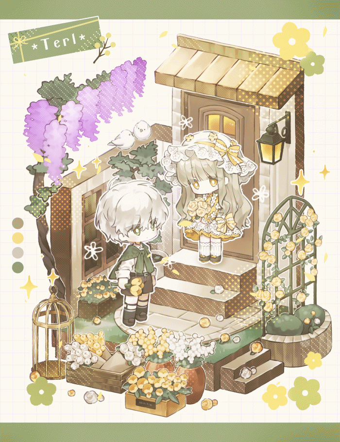 돌아가는 꽃잎색(2가지) , 꽃 색 , 등나무 색 , 건물 컬러 , 페어명 등